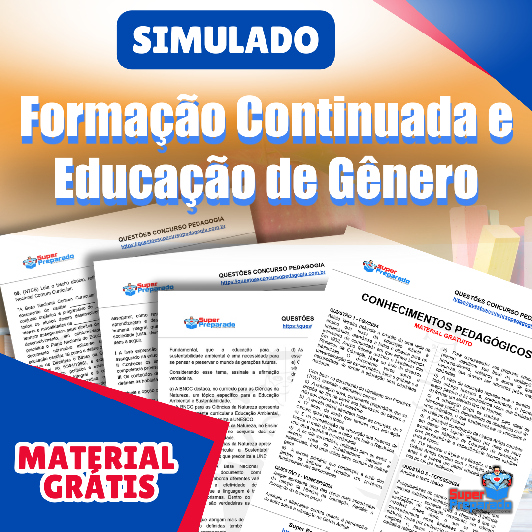 Baixe GRÁTIS o simulado em pdf de Formação Continuada e Educação de Gênero para concursos de professor. Aproveite para aumentar…