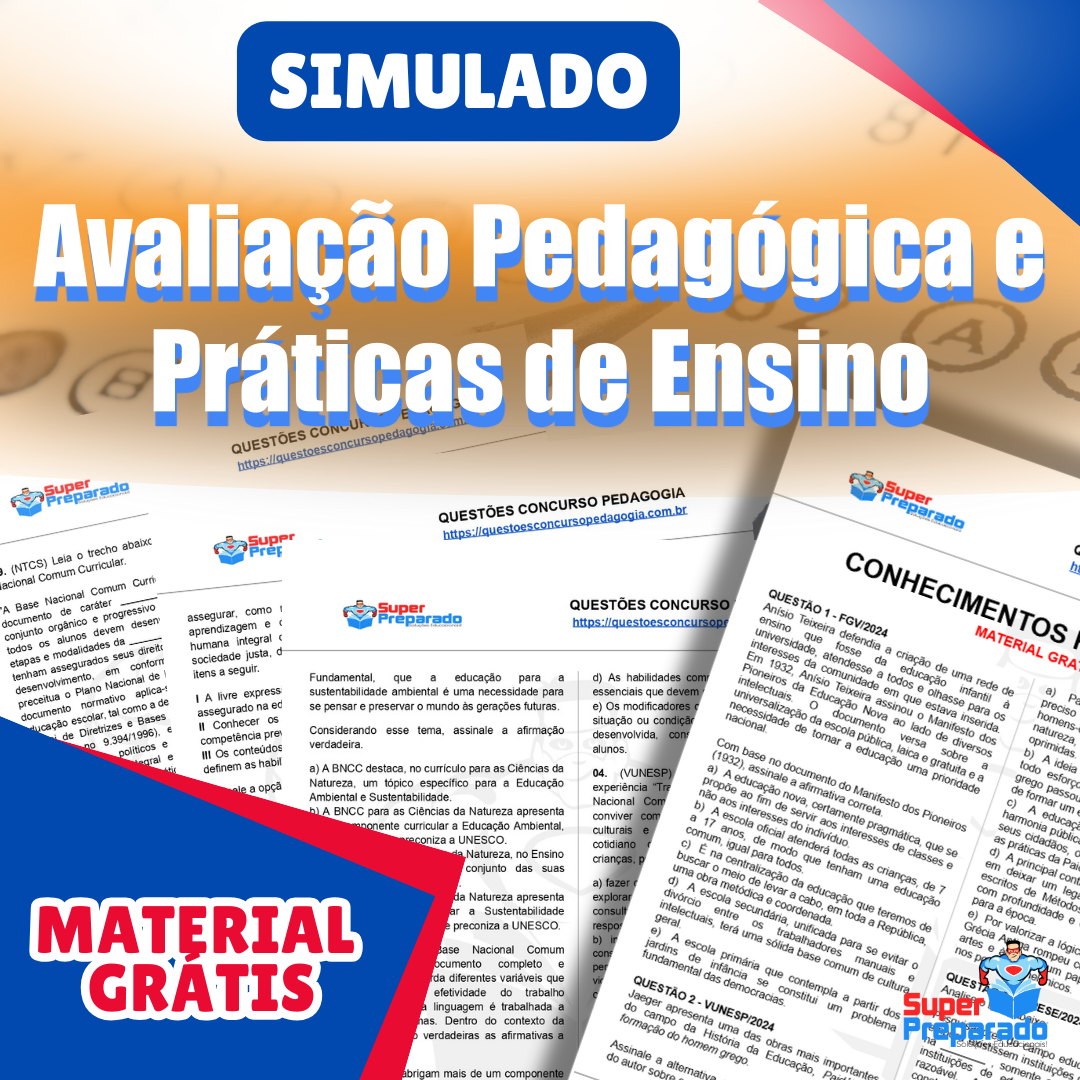 Baixe grátis o pdf do Simulado: Avaliação Pedagógica e Práticas de Ensino para se preparar para concursos de professores. Aprimore seus conhecimentos pedagógicos!