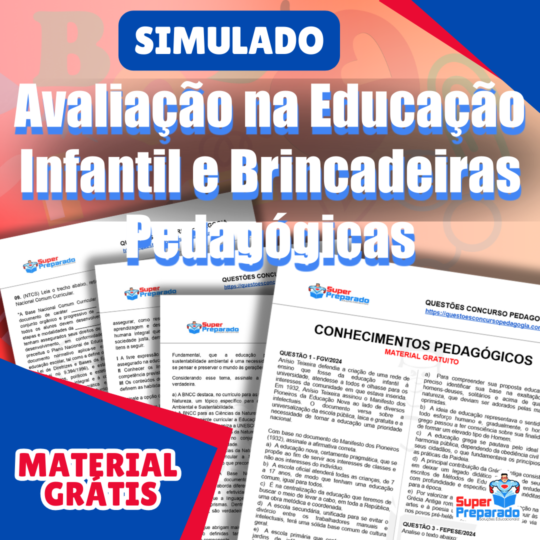 Baixe GRÁTIS o pdf do Simulado de Avaliação na Educação Infantil e Brincadeiras Pedagógicas e prepare-se para concursos de professores. Aproveite para aprimorar seus conhecimentos pedagógicos.