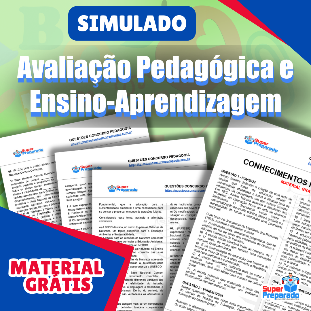 Baixe GRÁTIS o pdf do Simulado Avaliação Pedagógica e Ensino-Aprendizagem para concursos de professor. Aprimore seus conhecimentos pedagógicos agora!