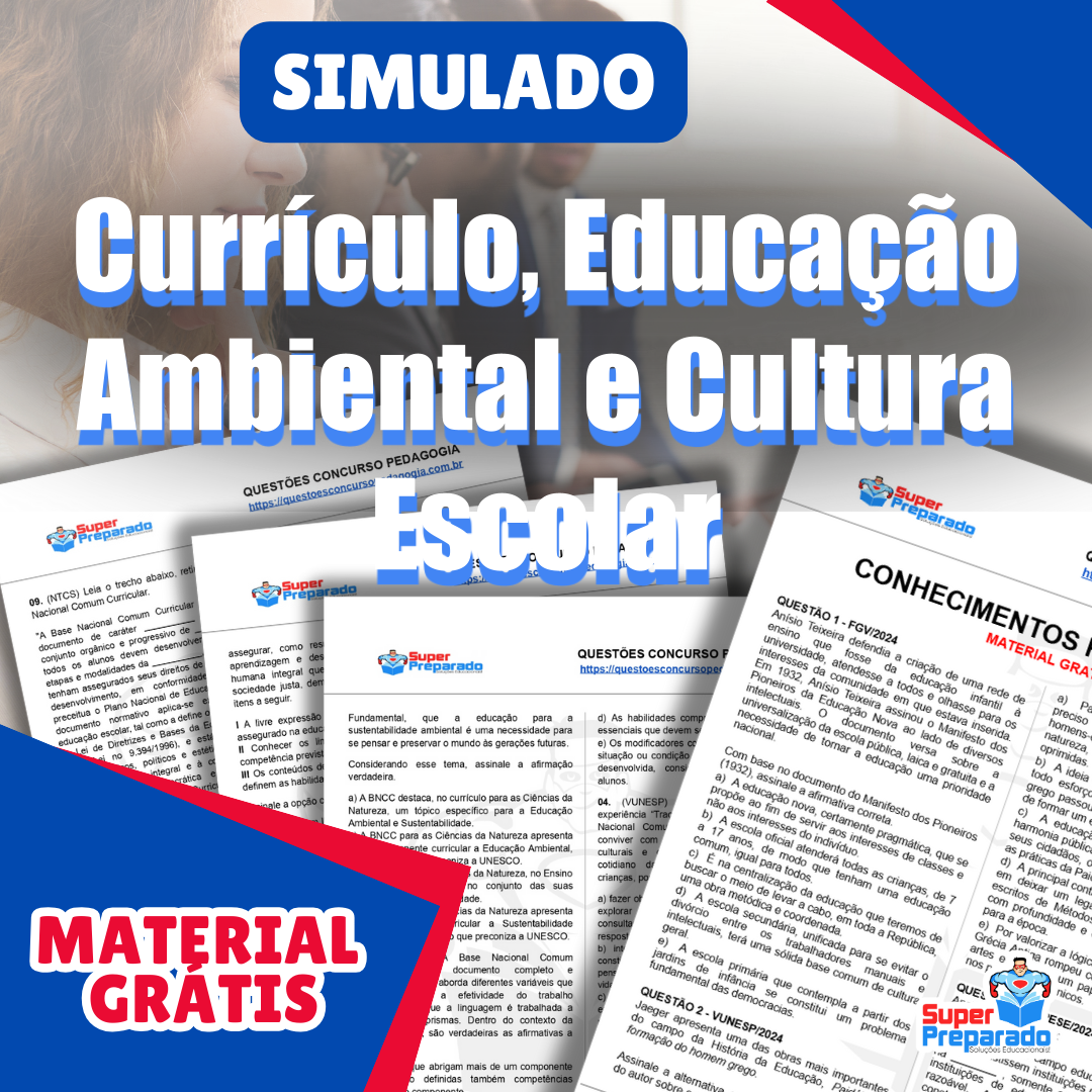 Fazer concursos públicos na área da Educação exige preparação e estudo aprofundado sobre todos os assuntos que são abordados nas provas. Pensando nisso, disponibilizamos aqui um simulado em PDF destinado para quem busca oportunidades em concursos de pedagogos, professores de diversas áreas, diretores escolares, coordenadores pedagógicos e educadores em geral. No simulado, você encontrará questões que abordam desde a cultura escolar, passando por concepções de currículo, até a importância da Educação Ambiental e Sustentabilidade. Não perca a oportunidade de testar seus conhecimentos e se preparar da melhor forma possível para os desafios que virão. Baixe agora mesmo o simulado e bons estudos!