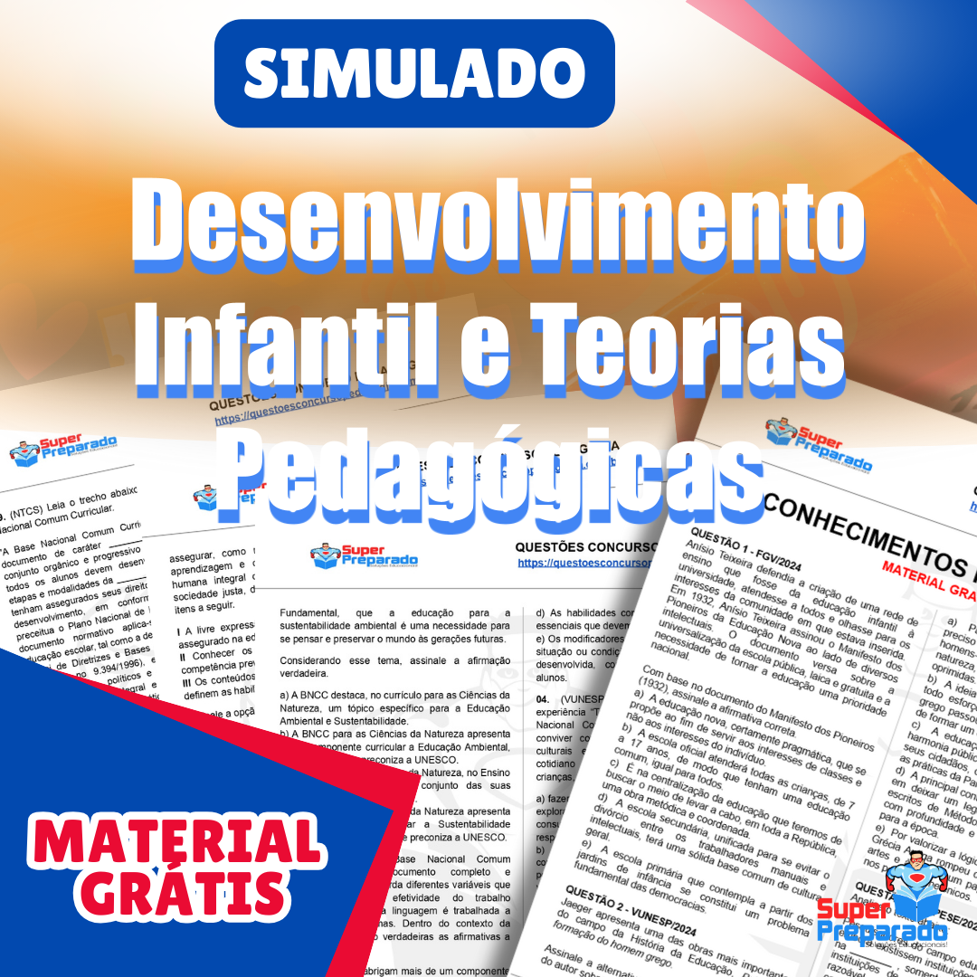 Baixe GRÁTIS o pdf do Simulado Desenvolvimento Infantil e Teorias Pedagógicas e prepare-se para concursos de professores, aprimorando seus conhecimentos pedagógicos.