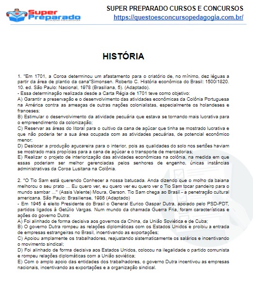 Simulado de História para concursos e seleções de professores. O simulado contém 10 questões e gabarito ao final, material ideal para testar os seus conhecimentos. Acesse e Baixe gratuitamente pelo link abaixo:
