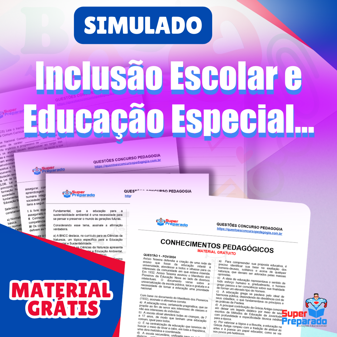 Baixe gratuitamente o pdf do simulado de Inclusão Escolar e Educação Especial. Prepare-se para concursos de professores e teste seus conhecimentos pedagógicos.