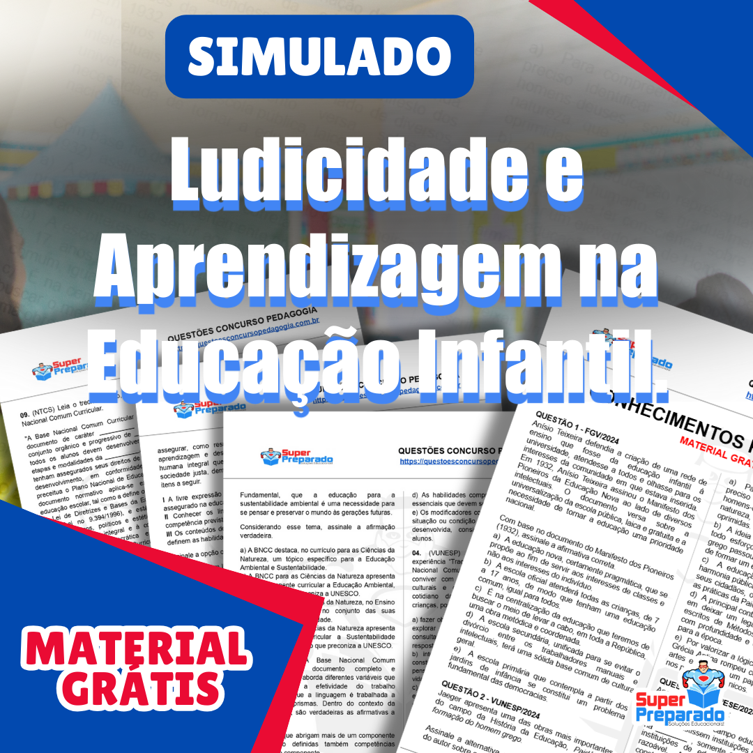 Baixe GRATUITAMENTE o simulado em pdf sobre Ludicidade e Aprendizagem na Educação Infantil. Prepare-se para concursos de professor e aprimore seus conhecimentos pedagógicos.