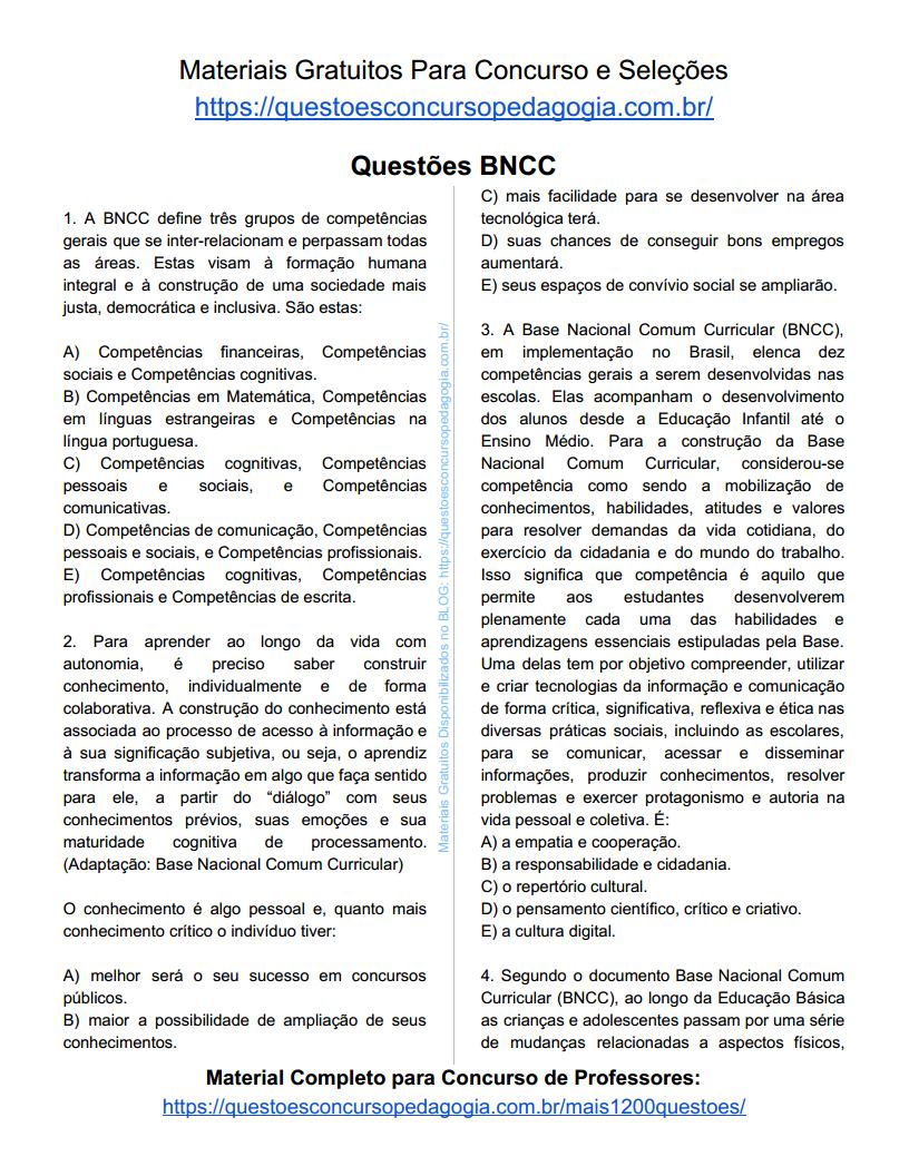 Baixe simulado com questões de BNCC para concursos e seleções 2020/2021. São questões aplicadas em provas de 2020. Simulado em PDF e prontinho para baixar. Bons estudos!