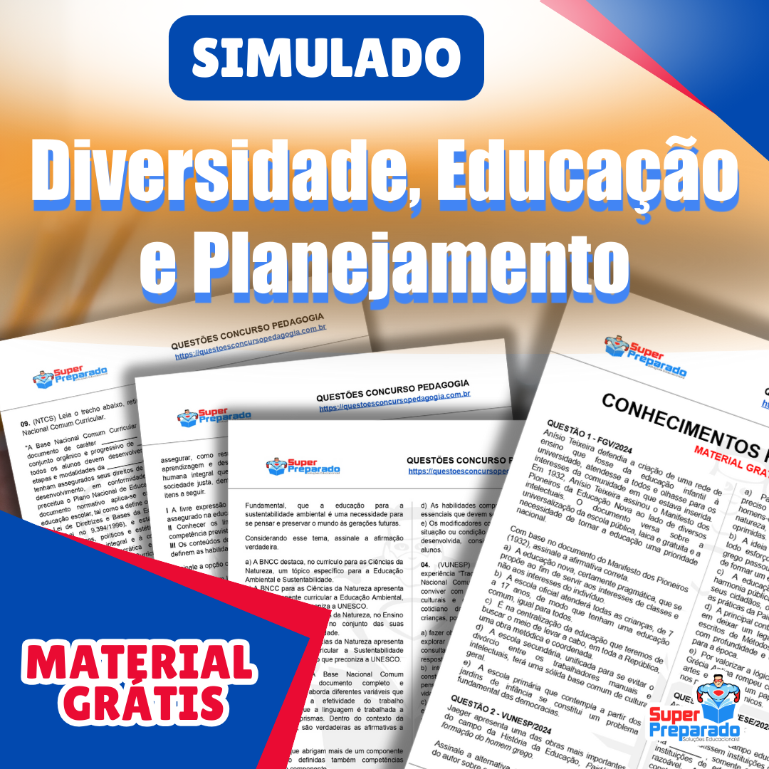 Baixe GRÁTIS o pdf do Simulado Diversidade, Educação e Planejamento e prepare-se para concursos de professores, testando seus conhecimentos pedagógicos.