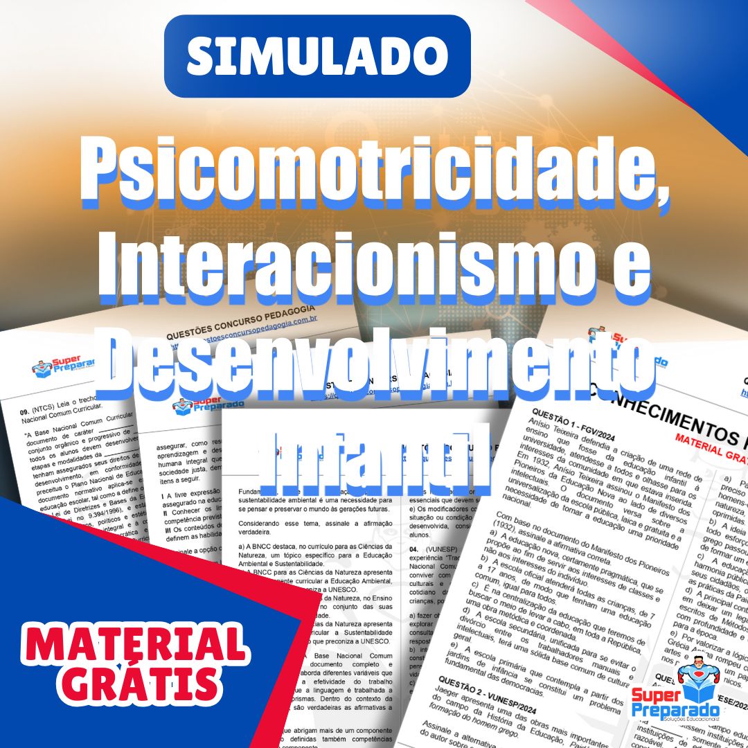 Baixe GRÁTIS o pdf do Simulado de Psicomotricidade, Interacionismo e Desenvolvimento Infantil e prepare-se para concursos de professor com conhecimentos pedagógicos.