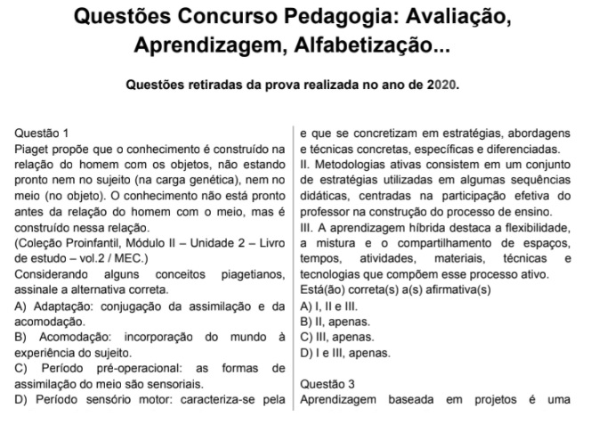 Questões de Concursos sobre Avaliação, Aprendizagem, Alfabetização. Simulado para seu concurso de professor, coordenador pedagógico, diretor escolar. Questões sobre conhecimentos pedagógicos para concursos públicos. Estude para concursos resolvendo questões! Contém 10 questões em pdf para baixar