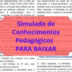 Neste post disponibilizamos um simulado em PDF com 10 questões de Conhecimentos Pedagógicos sobre : Teóricos da Educação, LDB, Planejamento, … para você baixar. Clique no link de acesso a seguir. Deixe sugestões nos comentários de mais simulados.