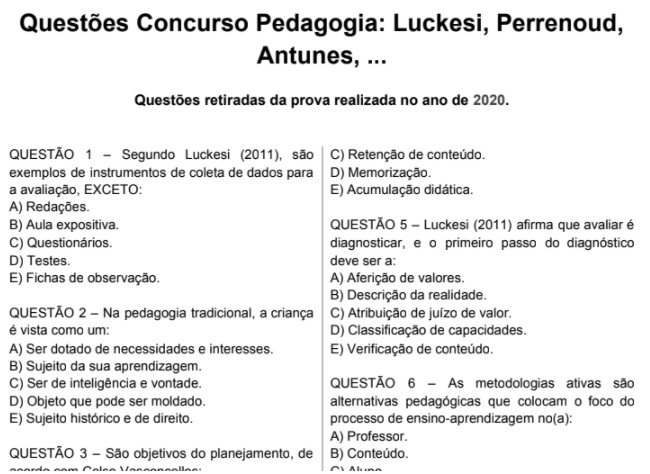Questões de Concursos sobre Luckesi, Perrenoud, Antunes, … Simulado para seu concurso de professor, coordenador pedagógico, diretor escolar. Questões sobre conhecimentos pedagógicos para concursos públicos. Estude para concursos resolvendo questões! Contém 10 questões em pdf para baixar