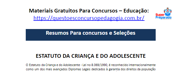 Hoje preparamos um resumo sobre o ECA para você que está se preparando para concursos e seleções na área da educação. Material que será útil em concursos de professores de educação infantil, ensino fundamental, ensino médio e até ensino superior. Após estudar o resumo que está em PDF você poderá resolver questões de conhecimentos pedagógico para sua preparação.
