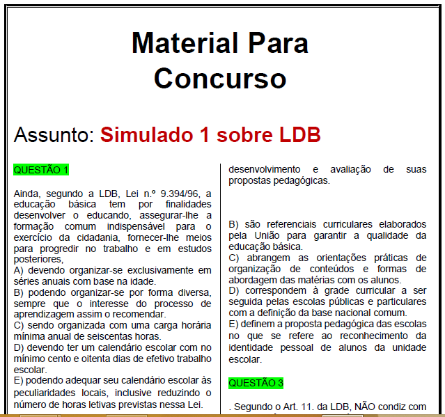 Para os colegas professores que acompanham o blog Questões Concurso Pedagogia hoje a postagem é um Simulado sobre a Lei de Diretrizes e Bases da Educação. A LDB hoje muitas modificações e estudar por um material desatualizado pode ser a razão para não conseguir a vaga no concurso. São 10 questões para avaliar seus conhecimentos pedagógicos sobre essa Lei