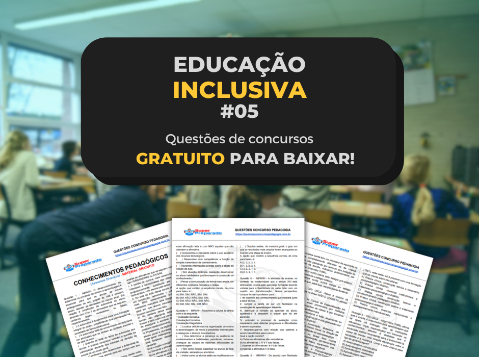 Baixe gratuitamente o PDF com questões selecionadas sobre Educação Inclusiva e outros temas relevantes de conhecimentos pedagógicos, que é ideal para quem está se preparando para concursos e seleções de cargos na área da educação. O material contém 10 questões criteriosamente escolhidas para auxiliar na sua preparação, além disso, todas elas possuem gabarito para que você possa verificar suas respostas e aprimorar seus conhecimentos. Baixe agora e comece sua preparação para o concurso e seleções: