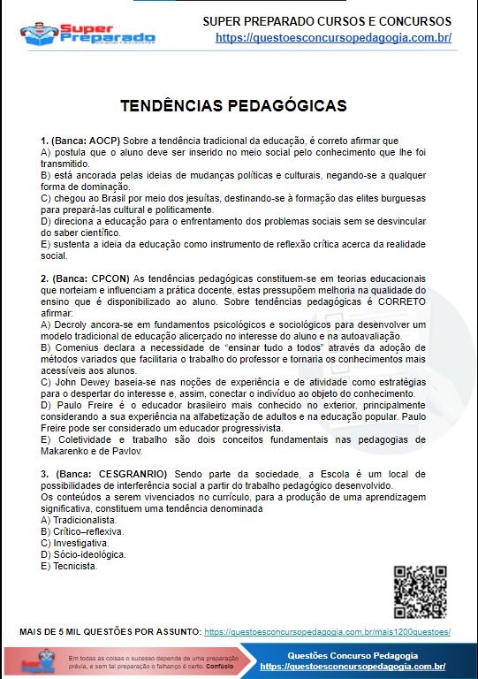 Simulado sobre Tendências Pedagógicas para concursos e seleções de professores. O simulado contém 10 questões e gabarito ao final, material ideal para testar os seus conhecimentos. Acesse e Baixe gratuitamente pelo link abaixo: