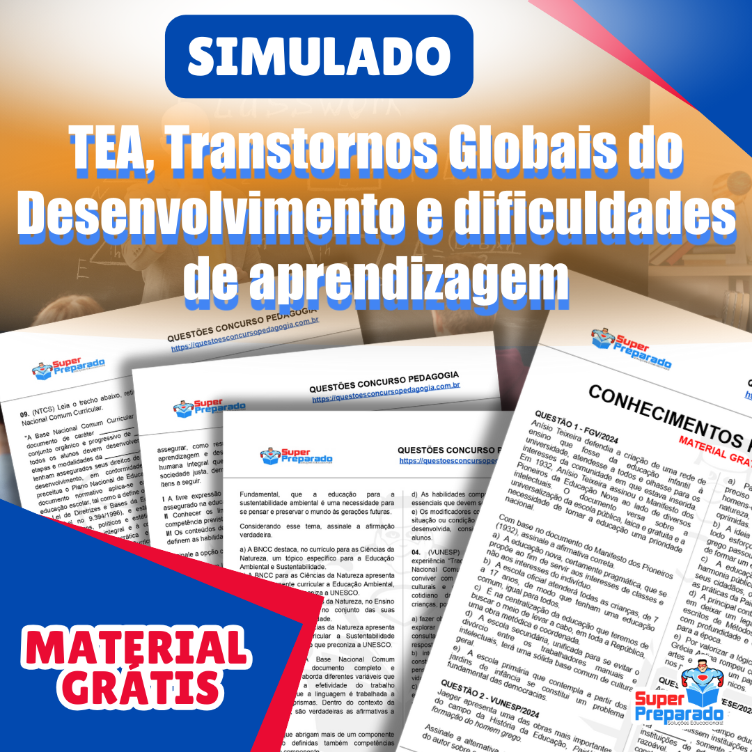 Baixe GRÁTIS o pdf do simulado TEA, Transtornos Globais do Desenvolvimento e dificuldades de aprendizagem. Prepare-se para concursos de professores e teste seus conhecimentos pedagógicos.