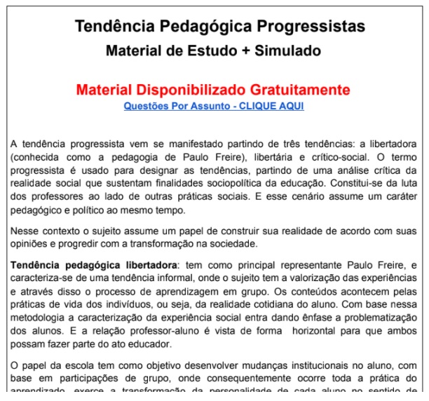 Material de estudo e questões de concurso sobre Tendência Pedagógicas. Este material trata de Tendência Pedagógica Progressistas. Um breve resumo e algumas questões para ver como domina o assunto.
